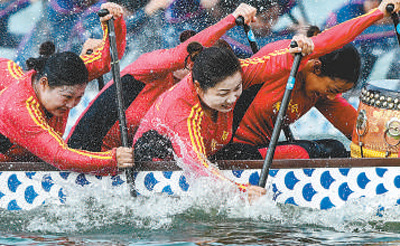| 重慶隊(duì)在女子22人龍舟200米直道比賽中。 |