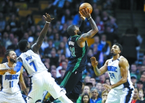 凱爾特人隊(duì)球員歐文(右二)在比賽中投籃! ⌒氯A社/美聯(lián)