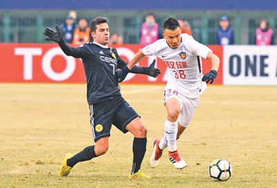 | 1月30日,天津權健隊球員孫可(右)與對手在比賽中拼搶。 |