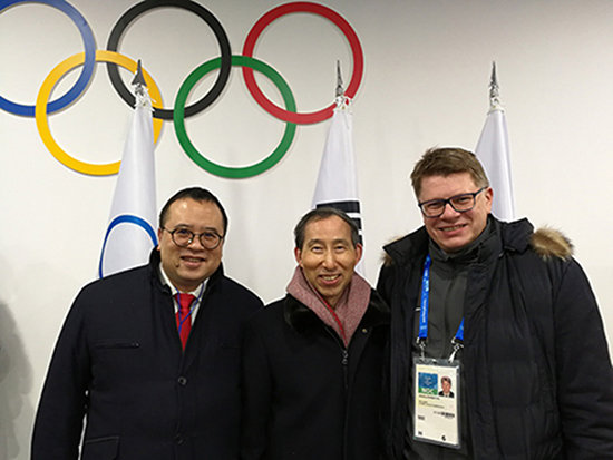 中國國際文化傳播中心執(zhí)行主席龍宇翔(中)在平昌冬奧會(huì)開幕式上