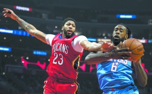 戴維斯(左)和快船隊(duì)球員德安德烈·喬丹在比賽中拼搶。 新華社/美聯(lián)