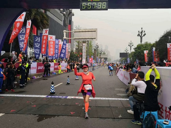 人民網(wǎng)副總裁唐維紅沖過重慶馬拉松終點(diǎn)線