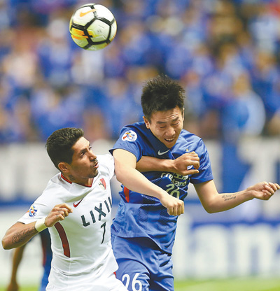 | 4月3日,上海申花隊(duì)球員秦升(右)在比賽中和對(duì)手爭頂。 |