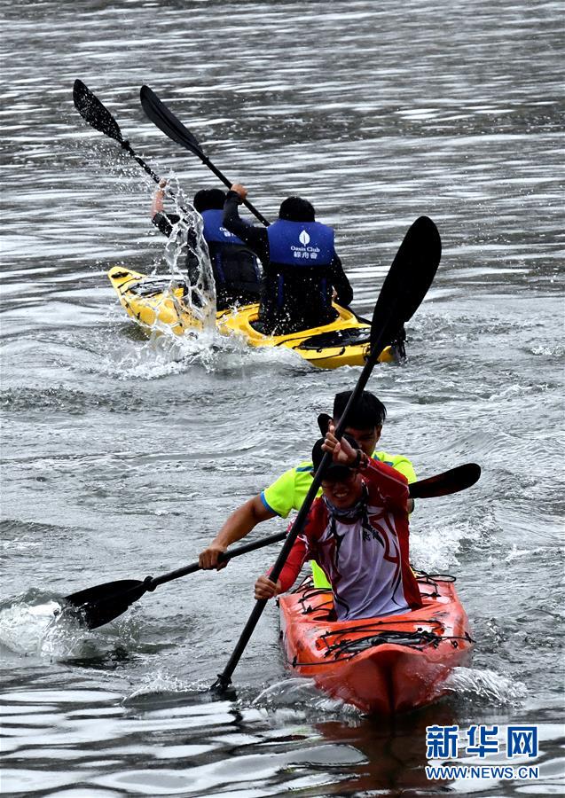 ↑11月16日,皮劃艇拔河賽選手在比賽中。 當(dāng)日,2018年福建將樂皮劃艇趣味賽在將樂縣金溪河開賽。本次比賽設(shè)皮劃艇拔河、皮劃艇接力、槳板競渡3個(gè)項(xiàng)目,吸引了福建、吉林等國內(nèi)120名選手參與。 新華社記者彭張青攝