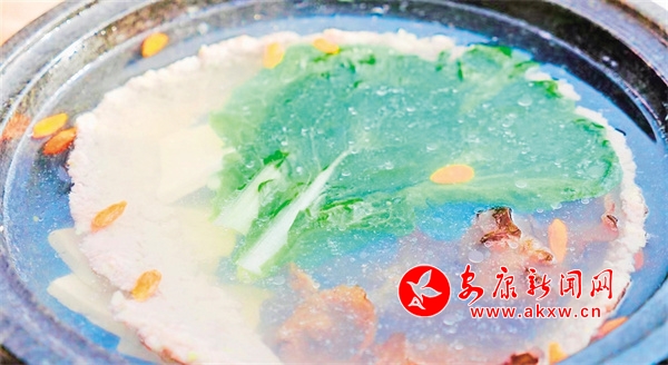 “白火石汆湯是我跟我祖父和父親學(xué)的手藝,13歲開始學(xué)做廚,白火石汆湯里面主要用到新鮮的豬肉,加蔥姜、蛋清、鹽、雞精以及料酒、生粉、蛋清,將其剁成肉泥,貼到陶盆里面,上厚下薄,里面陸續(xù)放上木耳、小青菜、豆腐,然后把石頭燒紅之后放進(jìn)陶盆內(nèi)的紗布中,只消幾分鐘,一道美味可口的白火石汆湯便做好了。”解遠(yuǎn)平一邊準(zhǔn)備食材,一邊向筆者介紹著白火石汆湯的做法。