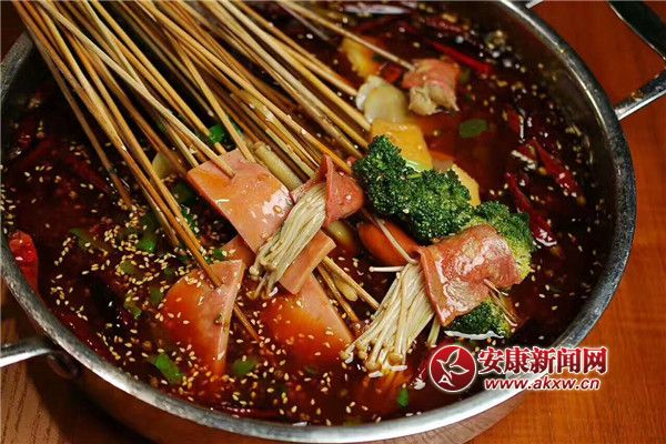“擼串”是安康人小聚的常備,麻油配辣醬,加之各種蔬菜、肉類的串串,一根根竹簽便將美味送到了我們嘴邊。