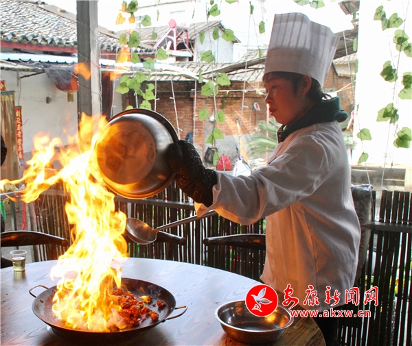 許苗苗是“好友之家”的三個合伙人之一,是個快人快語的女老板,她麻利地穿上白色大廚褂子,拿著一個從貴州定制的鐵鍋在手中掂了掂,迅速放在桌子上放油加熱,將預先準備好的紅綠尖椒倒入鍋中翻炒,隨后將腌制好的雞塊伴著酒倒入鍋中,霎時間火苗竄出半米高,圍觀的客人們發(fā)出陣陣感嘆。等上幾秒火小了,許老板不慌不忙地用鏟子翻炒大致兩分鐘,香味撲鼻的鐵鍋雞便做好了。許苗苗介紹道:“貴州鐵鍋雞一雞三吃,將一只整雞剔骨,骨頭用來熬粥,帶少許骨頭的雞肉入鐵鍋進行第一道加工食用,吃到一半的時候放入無骨雞肉上鍋燜煮十來分鐘,這樣才能將雞肉帶來的所有味覺體驗發(fā)揮到淋漓盡致。”g8T安康新聞網(wǎng)
