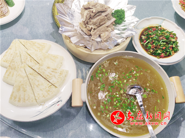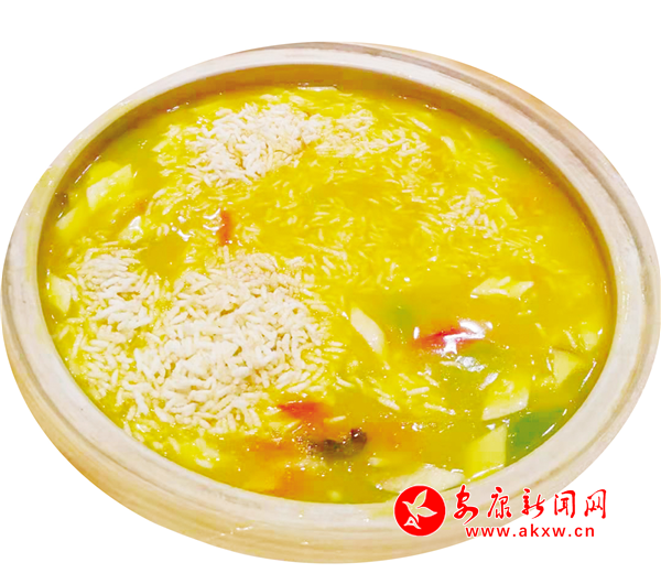 這是一道舌尖美味,制作時提前把海參、青筍、杏鮑菇、紅蘿卜切好汆水,備好墨魚花、蝦仁、棒骨高湯、南瓜泥、咸蛋黃,炸好香米,客人餐前,把炸好的香米復炸香脆裝盤,再把雞油、咸蛋黃、高湯和南瓜泥放入鍋內(nèi)翻炒,然后倒入海參、青筍、杏鮑菇、紅蘿卜、墨魚花、蝦仁等食材,燒開勾芡,調(diào)制成濃香金湯,起鍋裝盆,端到客人餐桌,當著食客的面將脆米倒入盛裝金湯的土盆里,攪拌均勻即可。這道菜看著五顏六色、金黃油亮,吃著養(yǎng)胃養(yǎng)顏,湯汁鮮美,營養(yǎng)豐富。Nzv安康新聞網(wǎng)