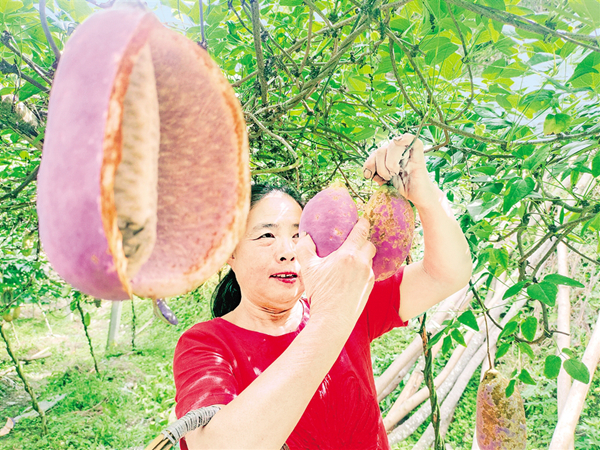 遠(yuǎn)嫁安徽的漢濱區(qū)雙龍鎮(zhèn)謝坪村魏澤會(huì),在外打拼一生,年逾花甲思鄉(xiāng)心切,于2018年回到家鄉(xiāng),在老家附近的一條山溝里,栽種了30畝八月炸。今年,八月炸喜獲豐收。走進(jìn)園區(qū),一行行、一架架八月炸藤蔓,掛滿了粉紅的果實(shí),有的裂開果肉,像極了開懷大笑的娃娃。魏澤會(huì)說:“今年產(chǎn)量達(dá)到3萬公斤左右,因八月炸不易保存,謝坪村第一書記汪道軒和陜西省生態(tài)廳環(huán)境信息中心駐村干部馬祥一起,先后通過網(wǎng)絡(luò)推介、電商促銷和臨時(shí)售賣點(diǎn)等幫我們銷售。”為了最大限度增收,魏澤會(huì)已嘗試?yán)冒嗽抡ㄡ劸、榨油等,均已成功,因產(chǎn)量很小,暫未對(duì)外銷售。