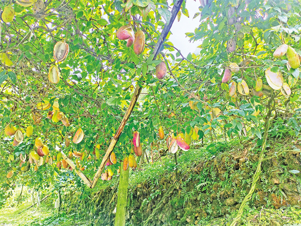 八月炸,中藥名稱“預(yù)知子”,是三葉木通的果實(shí),果子的形狀為橢圓形,長得像香蕉,沿腹縫線略彎,又似腎臟。成熟后,露出里面乳白色的果肉,口感甜糯,似冰激凌,富含糖、維生素C和12種氨基酸以及人體不能合成的纈基酸、蛋氨酸、異亮氨酸、苯丙氨酸、賴氨酸和清熱利濕、活血通脈、行氣止痛的功效。
