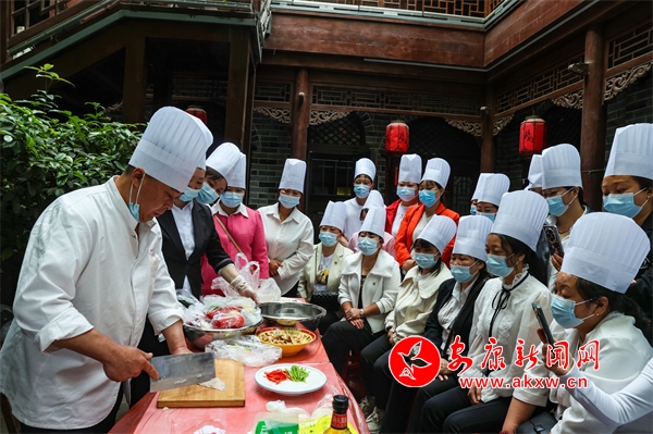 但隨著時代的發(fā)展,人們消費(fèi)理念的更新,能制作傳統(tǒng)白河“三點(diǎn)水”宴席的人越來越少,偌大一個縣,找不出幾個能夠獨(dú)當(dāng)一面制作傳統(tǒng)宴席白河“三點(diǎn)水”的廚師。所以他毅然決定辭去高薪的主廚工作,奔走于鄉(xiāng)村,上門做家政服務(wù),在實(shí)地操作技藝中傳幫帶一批會制作白河“三點(diǎn)水”宴席的鄉(xiāng)廚。