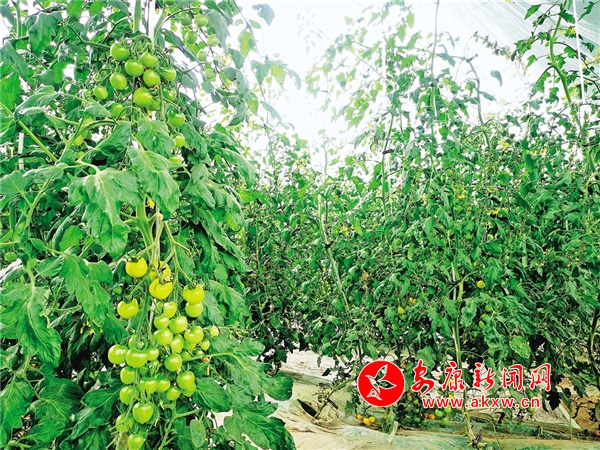 大片綠油油的菜園里,竹條支起的架子上爬滿了藤蔓,隱約可見(jiàn)藤蔓下藏著點(diǎn)點(diǎn)鮮紅,春日的艷陽(yáng)里,點(diǎn)點(diǎn)紅色在綠葉的掩映下,顯得格外動(dòng)人,大石嶺的圣女果紅了。