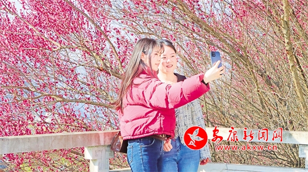 石泉縣濱江大道上紅梅競相綻放,廣大游客駐足觀看,打卡留念。譚文昌 攝