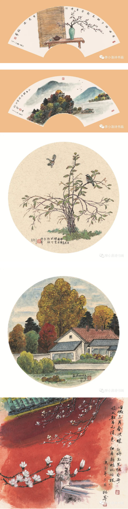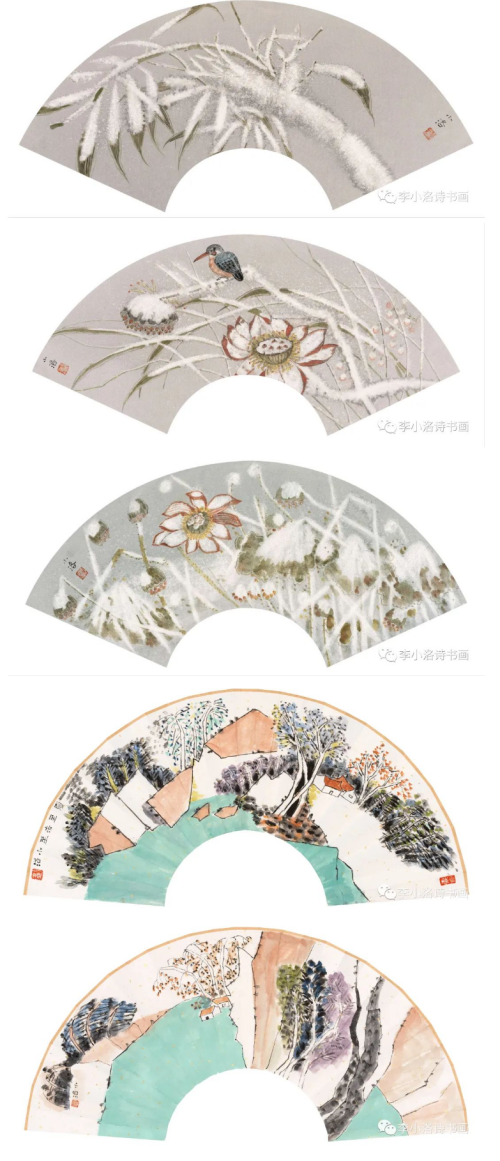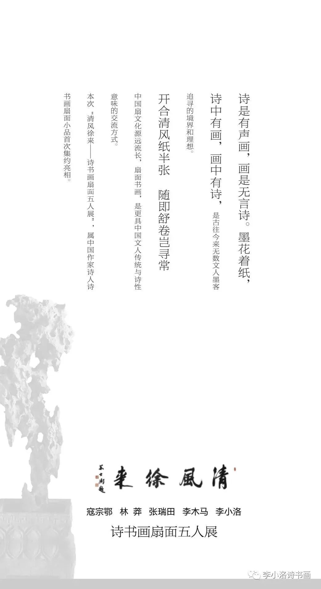 詩人寇宗鄂和林莽,均為《詩刊》編委,都曾擔(dān)任過《詩刊》的編輯部主任?茏诙踉鴰煆闹剿嫾倚毂蓖,詩人牛漢,詩畫兼擅。林莽作為白洋淀詩群和朦朧詩重要代表詩人,詩畫相融,桃李天下。張瑞田早年寫詩,后來多寫散文和書畫評(píng)論,是當(dāng)今活躍的評(píng)論家和書家。李木馬,李小洛,都曾參加過《詩刊》社的“青春詩會(huì)”,就讀魯迅文學(xué)院高研班,在詩歌和書畫創(chuàng)作上多年努力,取得了一定的成績……一人一格、一人一品,一扇一意、一扇一味,五位詩人作家的詩意筆墨,傳遞著各自對(duì)生活、藝術(shù)與世界的熱愛,認(rèn)知與發(fā)現(xiàn)。君子和而不同,透過一幀幀詩意盎然的扇面小品,在交相輝映的筆情墨趣中,可以看到他們相互啟迪,感染和照亮的友誼與藝術(shù)追求。