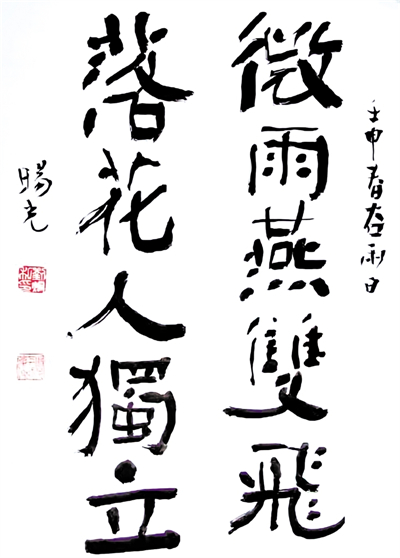 旸光先生淵博的家學(xué),深厚的學(xué)養(yǎng)為其書法技藝開掘出流淌不盡的源泉,正是他那非凡的經(jīng)歷與盤踞胸中的郁勃之氣,鑄就了別具一格的藝術(shù)風(fēng)采?v觀先生書法字里行間的布局、結(jié)構(gòu)、章法,即可以領(lǐng)略其高深的藝術(shù)修養(yǎng)。一般書法家給自己作品題款尚膽怯,更何況給山水畫人物、花鳥畫題款署名,書寫跋語(yǔ),要求書者不但有深厚的文學(xué)功底賦詞作詩(shī),再根據(jù)畫面的風(fēng)格,畫中所留空白虛實(shí)照應(yīng),用筆用墨的變化去應(yīng)對(duì),好的款跋使作品升華。而先生無(wú)論行、草、隸、篆,縱橫涂抹,信手拈來(lái)如行云流水,宛若天成,令人折服,先生曾為不少后學(xué)作品撰寫款名,跋語(yǔ)至今記憶猶新。