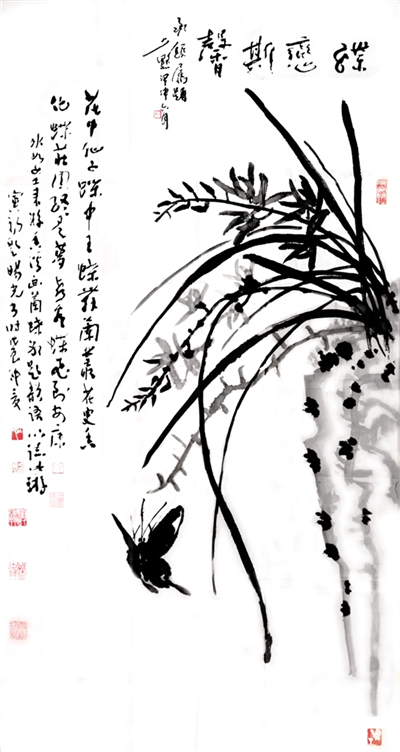 1988年,中國(guó)畫壇號(hào)稱“蝶王”的王冰如女士,以80歲高齡回到她曾工作生活10年之久的第二故鄉(xiāng)安康舉辦畫展,并且以詩(shī)書畫會(huì)友,特邀旸光先生和金州著名詩(shī)人劉寅初老人同游香溪,冰如老師興之所至,巧繪墨蝶,說(shuō)道“人言寅初老弟有曹子健七步成詩(shī)之才,今日以十步為限,將此畫為題,賦詩(shī)一首,旸光老弟書于其上如何?”寅初老只走了三步便道有了,于是順口吟誦,旸光先生揮毫急就“花中仙子蝶中王,蝶舞籣叢花更香,化蝶莊周終是夢(mèng),喜看蝶王飛安康。”一筆流暢的行草躍然于畫上,相輔相成,真是詩(shī)情畫意天作之合。一幅難遇難得難覓的“三絕圖”誕生了。冰如老師感慨萬(wàn)千,說(shuō)到“二位弟臺(tái)才高八斗,只可惜待在安康這個(gè)貧瘠的地方被埋沒(méi)了也!”這個(gè)場(chǎng)面是一種巧合,正是旸光先生“萬(wàn)事隨緣”的結(jié)晶,爾后經(jīng)書壇大家陳少默先生為之題跋做款,更是錦上添花,成了四絕圖。冰如、少默、旸光、寅初先生已然作古,這段翰墨丹青之情,將永存世間傳為藝術(shù)佳話。